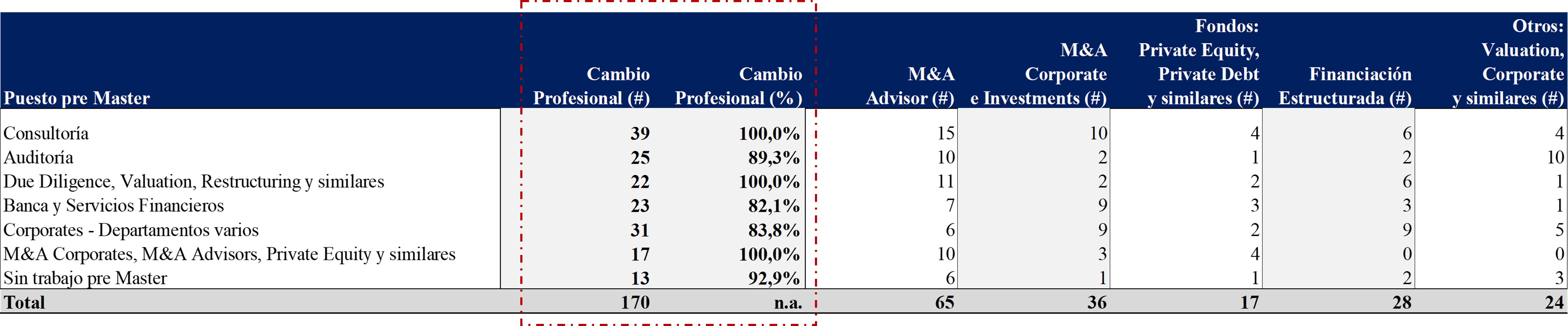 El master en Corporate Finance, M&A y Private Equity está enfocado a sector generalista, incluyendo Real Estate, Project Finance, FIG (Bancos y Aseguradoras) y Tech. Es el adecuado cuando el alumno no tiene super claro, que quiere únicamente Salidas Profesionales en un sector específico; y con este master hay ejemplos de alumnos en todos los sectores dentro de la industria.
